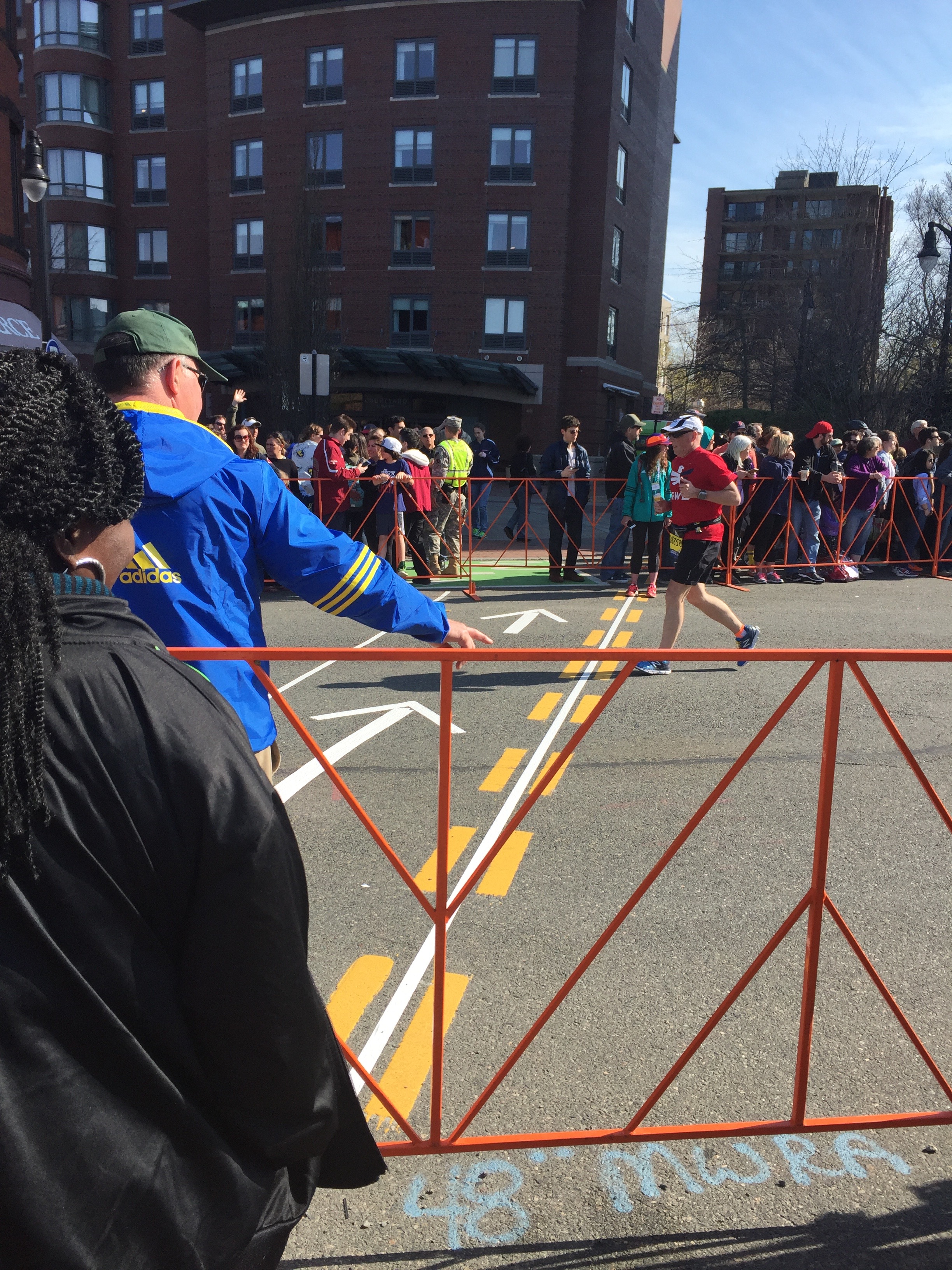 And, recently, stuck on one side of the barricades at the Boston Marathon, our guesthouse on the other side, the air was cooling faster than the runners. The road was long. How would we get across? Dark mutterings were heard in the crowd. But there was a system! We found a crossing point where security checked the oncoming ‘traffic’ then waved us over in groups of two or three. And the crowd of tired onlookers, thinking about home and dinner, formed a line. The mood lifted. We danced across, happy to be a part of the whole shebang.